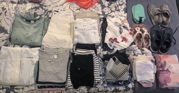 - Not pictured – baseball cap and sun hat. I’ll pack the ball cap and wear the sun hat on the plane